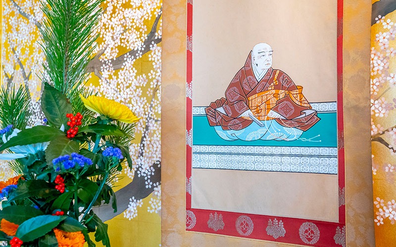 多くの皆様にお力添えをいただき、令和7年1月には新本堂の落慶を迎えました。内陣の仏画には珍しく、桜の木を描いていただきました。これは、親鸞聖人の「明日ありと 思う心の あだ桜 夜半に嵐の 吹かぬものかは」
